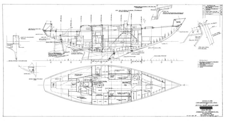 ‘Sunstone’ was designed in late 1964 by Sparkman & Stephens. In the design, Olin Stephens developed his ‘Finisterre’ model, keeping the centreboard, but deepening the hull and adopting a low aspect, but powerful sloop rig. However, ‘Sunstone’ was revolutionary as the first of S&S’s many successful fin and skeg designs. Her basic dimensions, with the exception of draft are similar to ‘Finisterre’s’: LOA – 39.75′, LWL – 29′, Beam – 11.5′, Draft – 5.4’/7.2′. She was built to Lloyds 100A in 1965 and has kept her varnished hull ever since. ‘Sunstone’ has Olin Stephens’ endorsement as, “a boat that has probably had the widest spectrum of usefulness of any designed by S&S.” (“Lines”, 2002) In “Heavy Weather Sailing”, Olin also says, “Among S&S designed centerboarders, ‘Sunstone’ seems a good example of a centerboarder suited to heavy weather sailing.”